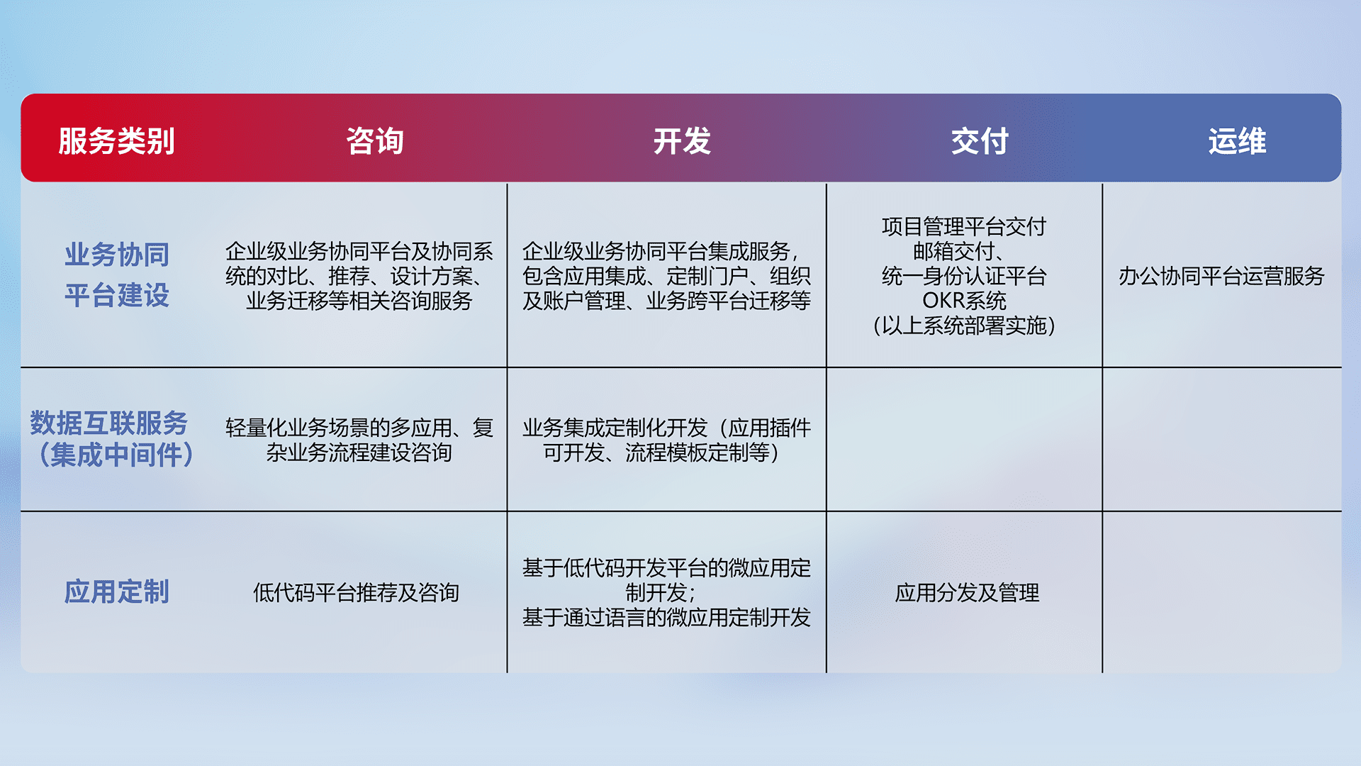 针对钉钉、、企微、、、、IDaas等平台级产品提供产品的规划、、、方案、、交付、、、、定制化开发等服务,,,实现如统一协同办公、、、智能客户服务、、混合会议管理、、智能数据查询、、、等业务场景,,实现数字化转型。。。